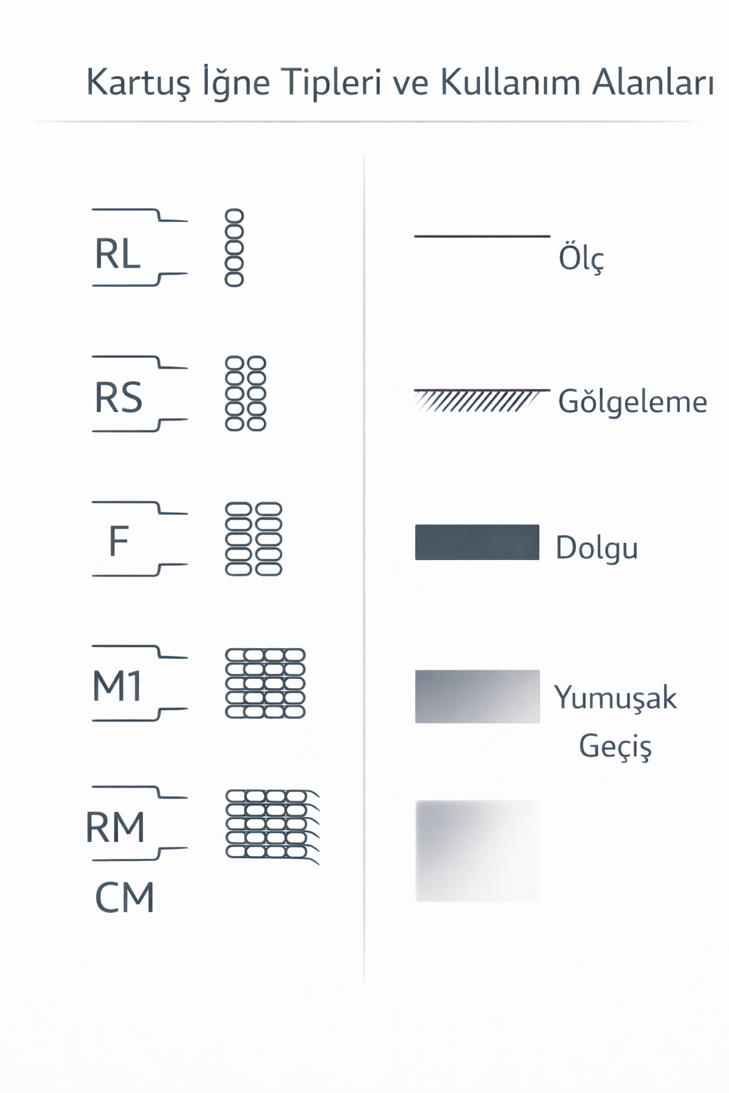 Kartuş iğne seçimi; yalnızca “iğne kodu” üzerinden değil, uygulama hedefi ve cilt dinamikleriyle birlikte yönetilmelidir. RL çizgi ve detayda, RS ve RM yumuşak gölgede, magnumlar geniş alanda operasyonel avantaj sağlar. Standart bir eşleştirme tablosu oluşturup her uygulamada aynı kalite çizgisini yakalamak, uzun vadede en sürdürülebilir yaklaşımdır.