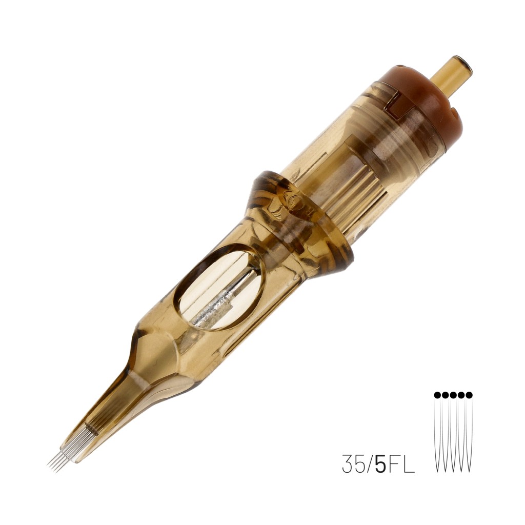Kwadron 1205 FLLT (5FL), Flat dizilim ve Long Taper uç yapısıyla küçük alan dolgu, kontrollü pigment yerleştirme ve keskin kenarlı gölgelendirme uygulamaları için tasarlanmış tek kullanımlık kartuş dövme iğnesidir.