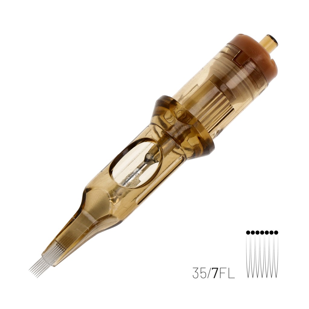 Kwadron 1207 FLLT (7FL), Flat dizilim ve Long Taper uç yapısıyla kontrollü dolgu, keskin kenarlı gölgelendirme ve lineer pigment yerleştirme uygulamaları için tasarlanmış tek kullanımlık kartuş dövme iğnesidir.