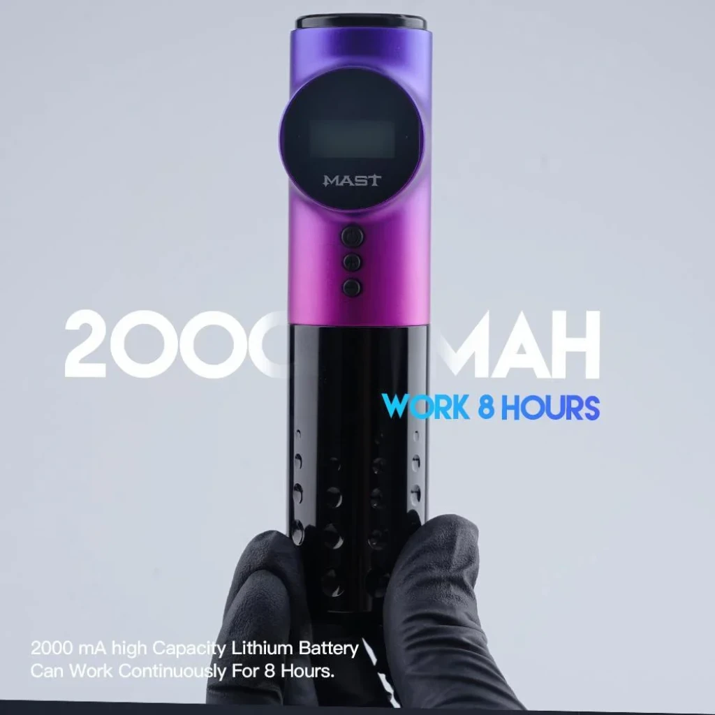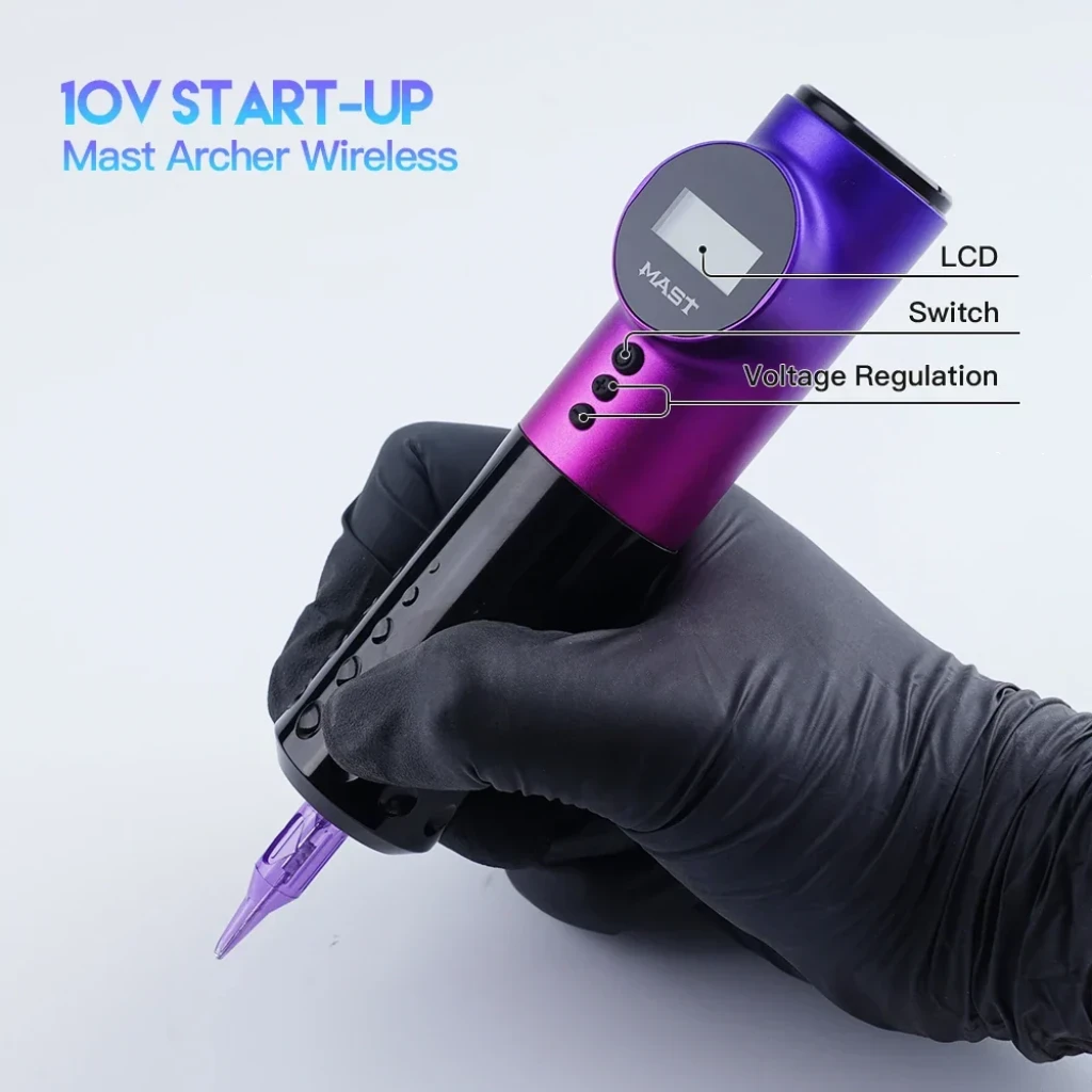 Mast Archer Blue Gradient, kablosuz tasarımı ve 3.5 mm sabit stroke uzunluğu ile line ve shading çalışmalarına uygun rotary dövme makinesidir. LCD ekran üzerinden voltaj kontrolü sağlanabilir ve mobil kullanım imkânı sunar.