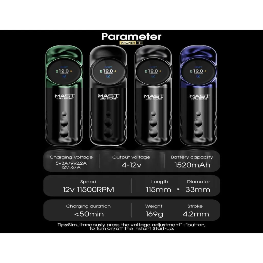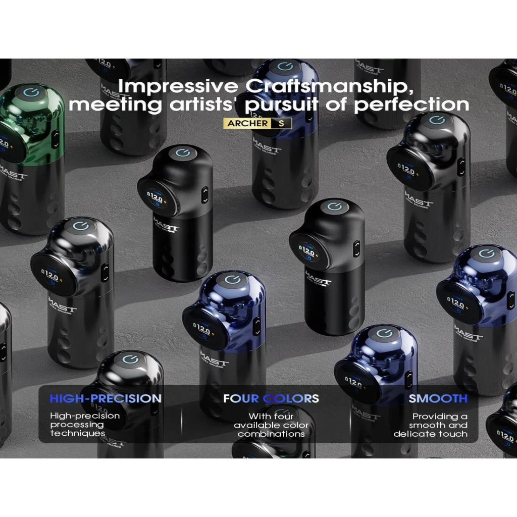 Mast Archer S Kablosuz Dövme Makinesi (Green & Black | 4.2 mm), profesyonel dövme uygulamaları için geliştirilmiş kablosuz bir dövme makinesidir. 4.2 mm stroke uzunluğu sayesinde dolgu, gölgelendirme ve tok vuruş gerektiren çalışmalarda kontrollü kullanım hedefler.