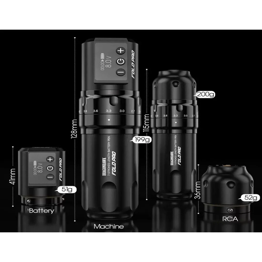 Mast Fold Pro 7 Kademeli Stroke Kablosuz Pen Dövme Makinesi – Tek Bataryalı (Siyah), ayarlanabilir stroke yapısı ve MCore motor teknolojisi ile profesyonel kullanım için geliştirilmiş kablosuz rotary pen dövme makinesidir. 2.4 mm – 4.2 mm aralığında 7 farklı stroke seçeneği, lining, shading ve dolgu uygulamalarında farklı teknik ihtiyaçlara uyum sağlar.