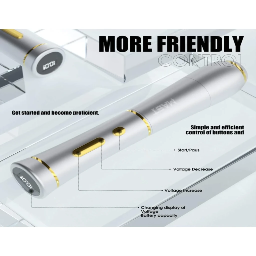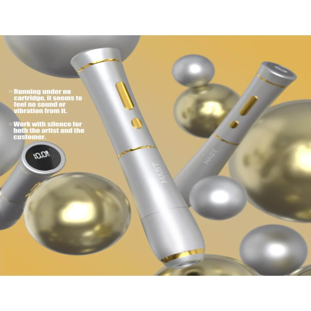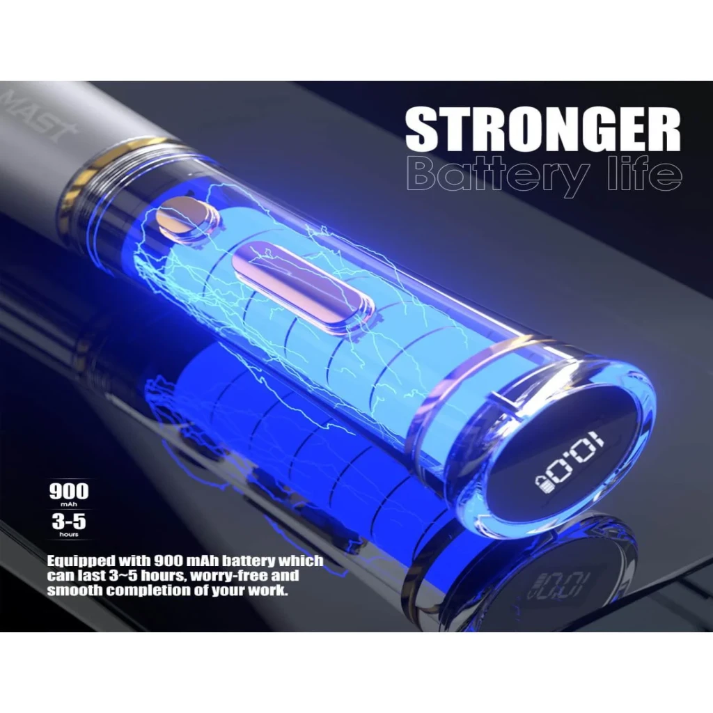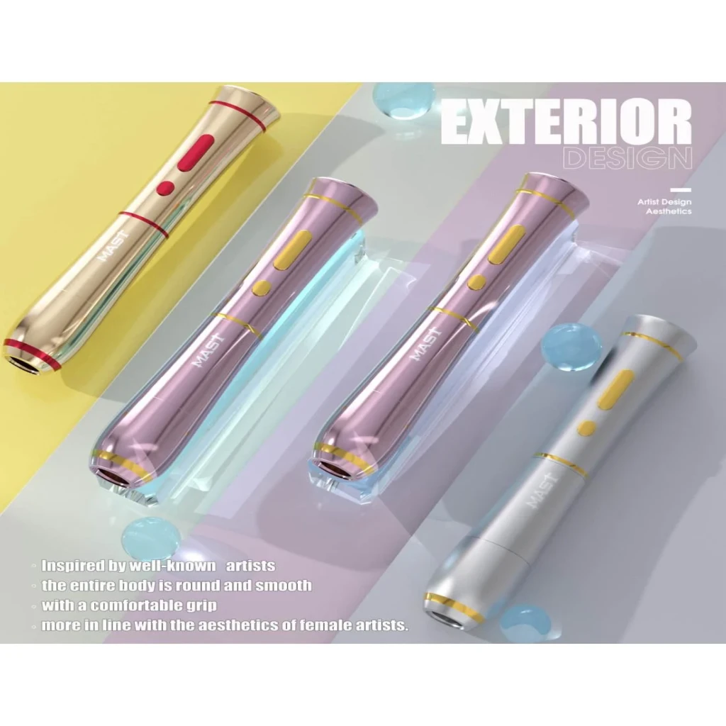 Mast P40 PMU Kablosuz Kalıcı Makyaj Makinesi – Siyah, profesyonel kalıcı makyaj uygulamaları için tasarlanmış kablosuz pen tipi bir cihazdır. 2.5 mm stroke uzunluğu ve ayarlanabilir voltaj aralığı sayesinde dudak, kaş, eyeliner ve SMP uygulamalarında kontrollü ve stabil çalışma imkânı sunar.