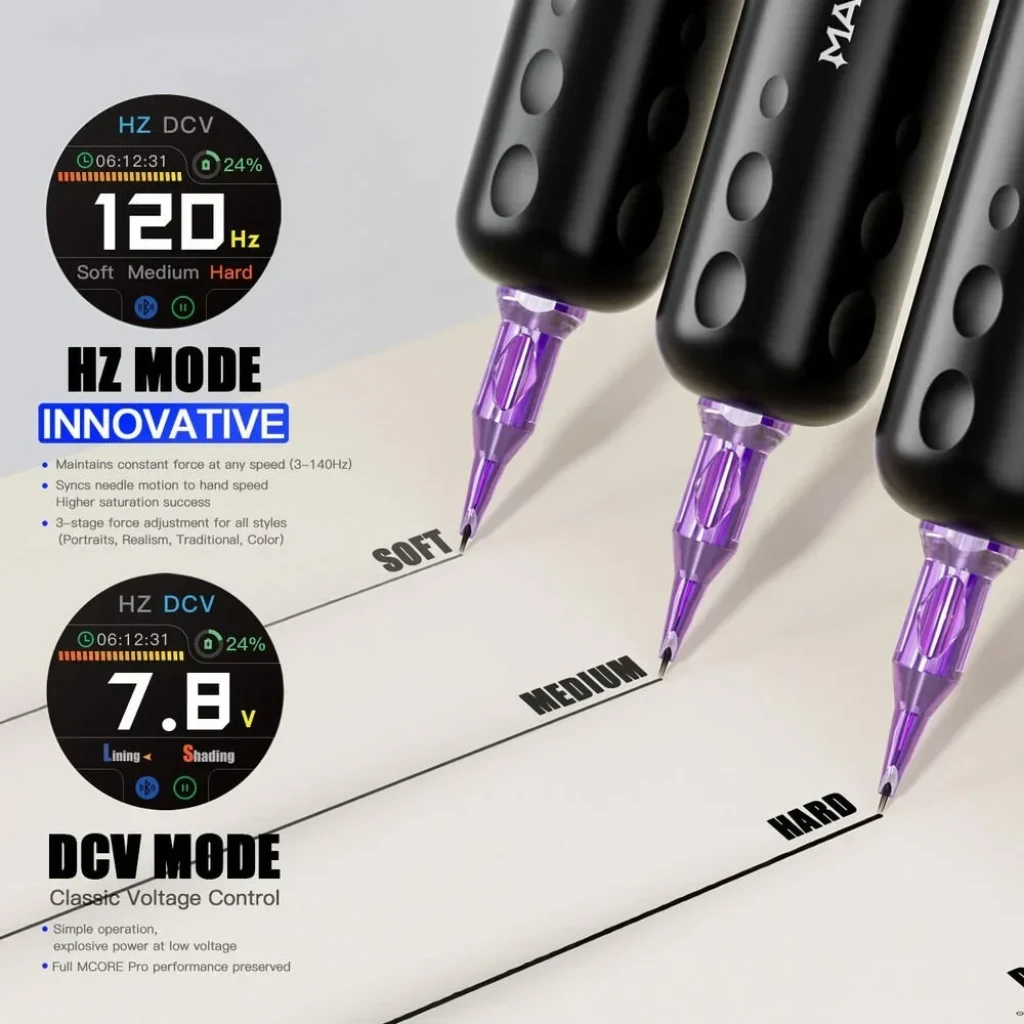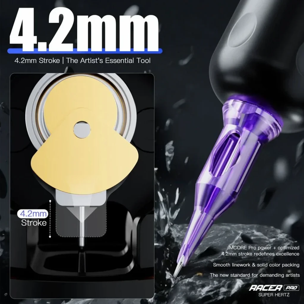 Mast Racer Pro 4.2 mm Stroke Kablosuz Rotary Pen Dövme Makinesi – Siyah, güçlü vuruş karakteri ve ayarlanabilir çalışma modları ile profesyonel dövme uygulamaları için tasarlanmış kablosuz rotary pen modelidir. MCORE Pro motor yapısı ve entegre bataryası ile stabil ve kontrollü performans sunar.