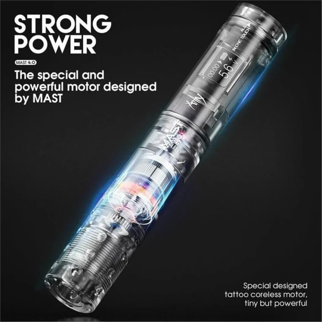 Mast Tour Amy 4.0 Stroke Kablosuz Dövme Makinesi, kompakt yapısı ve kablosuz kullanım avantajı ile kısa ve orta seanslar için tasarlanmış profesyonel rotary pen dövme makinesidir. 4.0 mm stroke uzunluğu, çizgi ve dolgu odaklı uygulamalarda dengeli vuruş karakteri sunar. Mcore-C1 çekirdeksiz motor yapısı ile stabil çalışma sağlar.