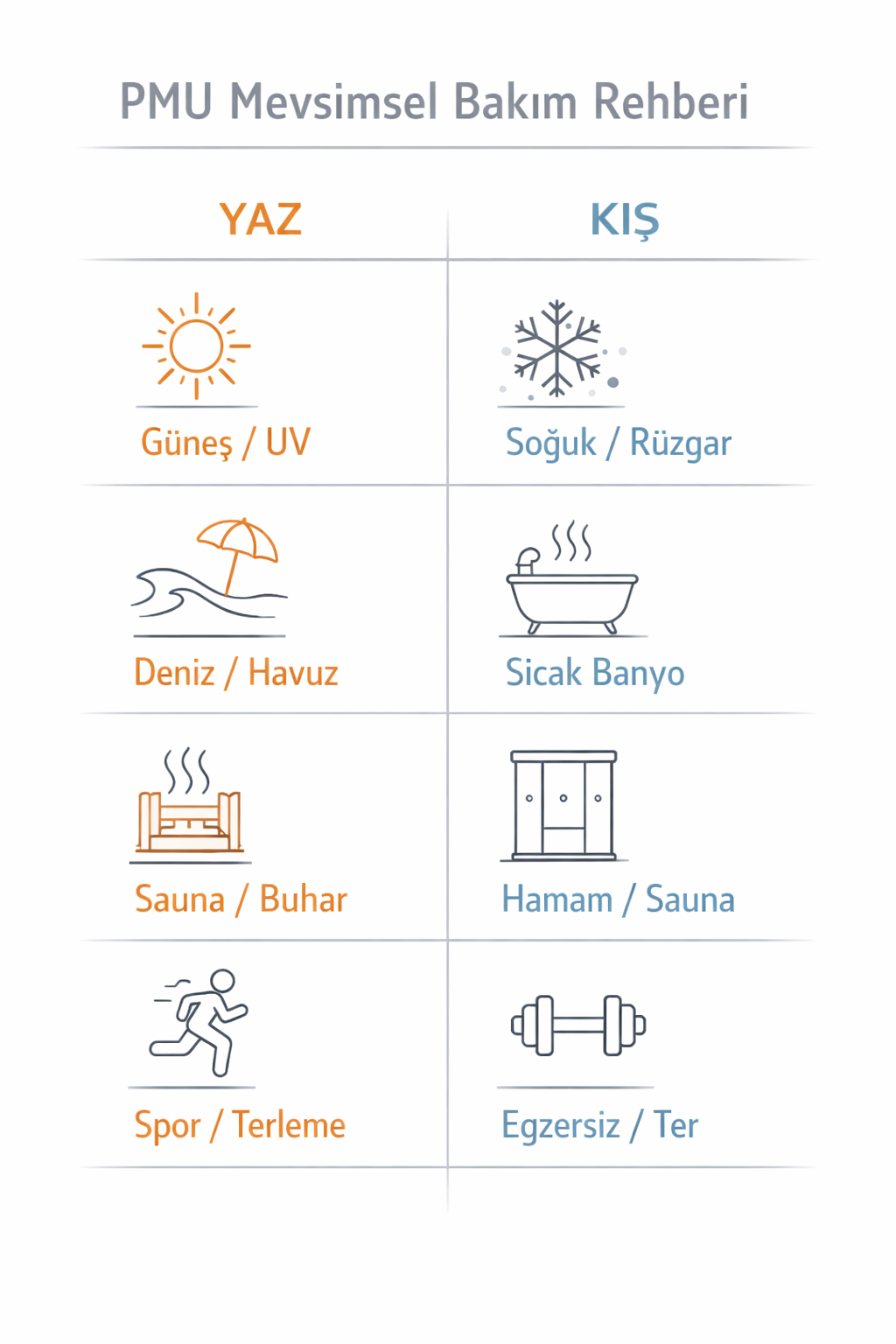 PMU sonrası süreç, mevsime göre yeniden çerçevelenmelidir. Yazın UV–deniz–terleme ekseni; kışın kuruluk–ısıtma–buhar ekseni yönetildiğinde, sonuçlar daha stabil ve öngörülebilir bir karakter kazanır. En doğru yaklaşım; uygulama öncesinde yaşam tarzı ve mevsim planı üzerinden kişiselleştirilmiş bir süreç kurgulamaktır.
